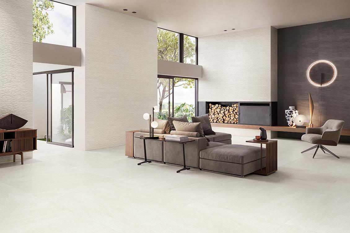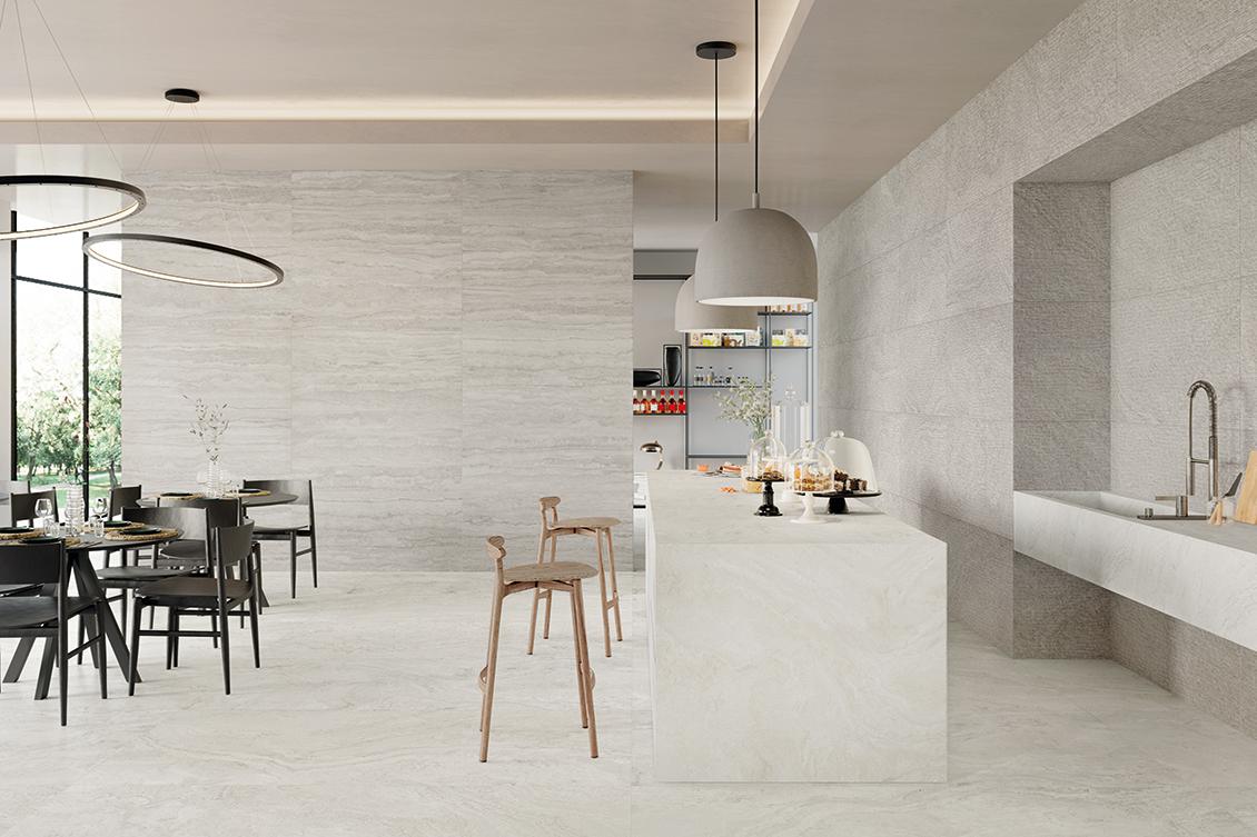 Was die Vor- und Nachteile von Feinsteinzeug betrifft, so haben wir einerseits hervorragende Leistungsmerkmale: Beständigkeit gegen Abrieb, Beanspruchungen, Chemikalien, Witterungseinflüsse und Temperaturwechsel sowie äußerst geringe Wasseraufnahme. Es ist von Natur aus hygienisch und antibakteriell und zudem pflegeleicht. Andererseits kann sich die Härte der Oberfläche als Nachteil erweisen, denn sie erfordert mehr Sorgfalt beim Bohren von Löchern auf der Fliese. Außerdem ist Feinsteinzeug schwerer als Keramik, weshalb die Tragfähigkeit der Rohfläche sicherzustellen ist. Dieses Problem lässt sich mit Fliesen geringer Stärke und somit geringem Gewicht lösen, die in großer Auswahl auf dem Markt angeboten werden. Der Katalog von Unique Travertine by Provenza ist ein Beispiel dafür, wie vielfältig die Auswahl an Feinsteinzeugfliesen in Bezug auf Größen, Stärken und Formate ist. Die Kollektion zelebriert die charakterstarke Ausstrahlung von Travertin in einer ästhetisch und technisch anspruchsvollen Oberfläche. Eine naturnahe Steinoptik, authentisch wirkend mit fein ausgearbeiteten Details: der Verlauf der Äderungen von Vein Cut, die schlichte Bearbeitung von Minimal, die plastische Ausstrahlung von Ruled, der Retro-Charme von Ancient. Die vier Oberflächen sind in vier Farbvarianten von White bis Chocolate erhältlich, die jede Nuance des Steins, jede Möglichkeit der Keramikkunst ausloten.